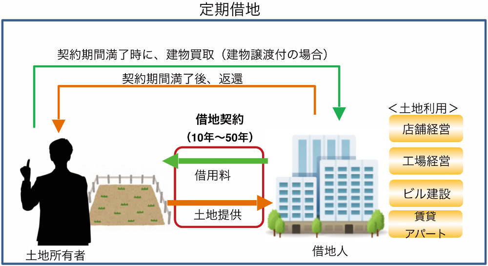 - 借地期間は30年以上、期間満了時に土地所有者が借地人から建物を買い取ることで権利が消滅する借地権