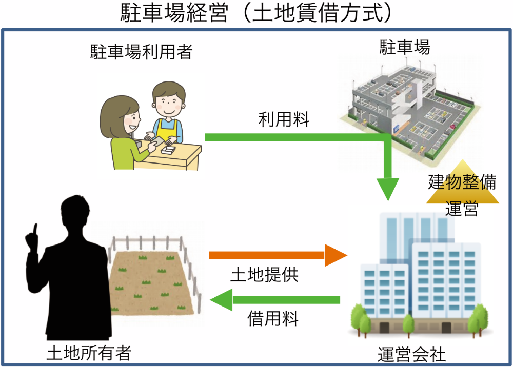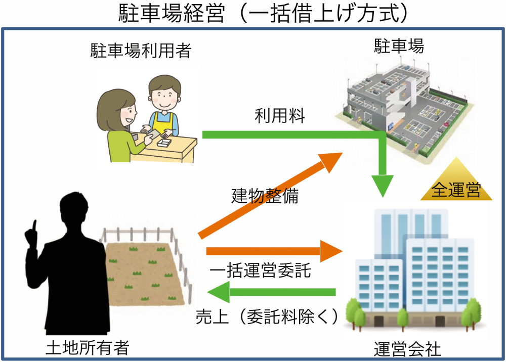 管理業者がオーナーから駐車場設備を一括して借り受け、利用者の募集など含めた全ての業務運営を行い、管理業者がオーナーへ「賃料と売上一部」を支払う方式です。
