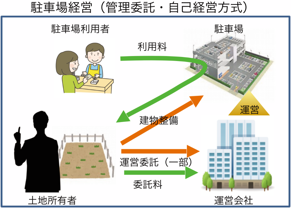 オーナーが駐車場設備など初期投資を負担し、オーナーが運営する駐車場の一部業務(料集金・点検・清掃など)を管理業者に委託する方式です。