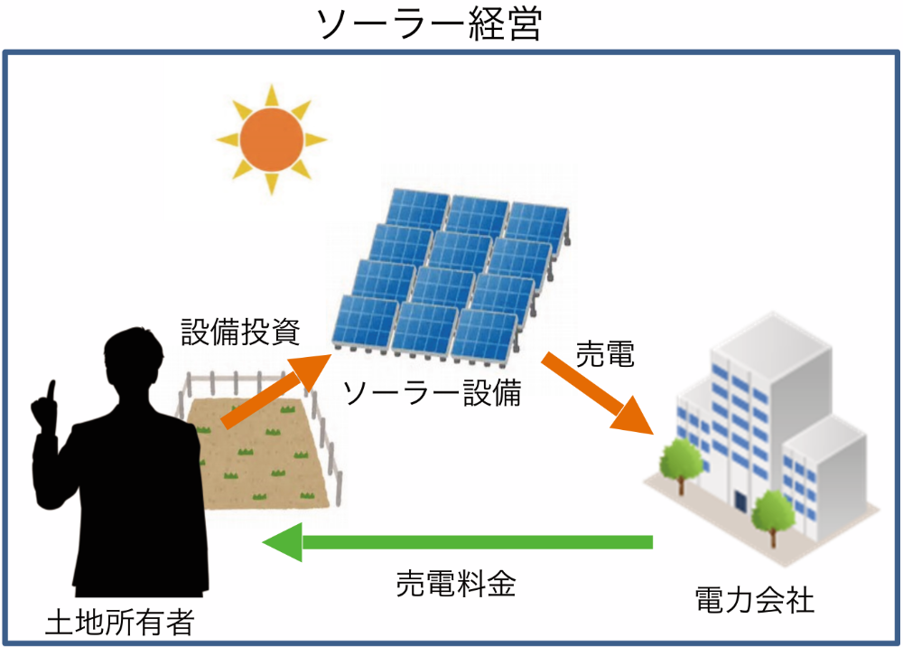 土地保有者がソーラー発電設備を整備し、ソーラーパネルによって発電された電力を電力会社へ売電する方法です。「固定価格買取制度」により、電力会社と10年又は20年の間決められた価格で売電する契約ができるため、土地所有者は初期投資がかかりますが、電力会社から売電による安定した収入が得られる方法です。