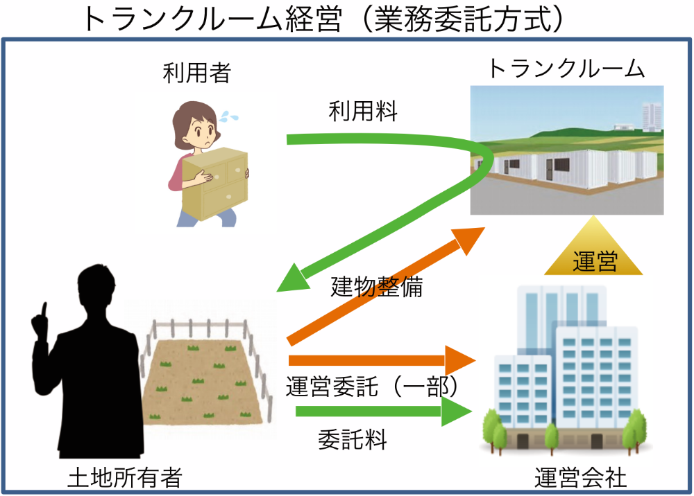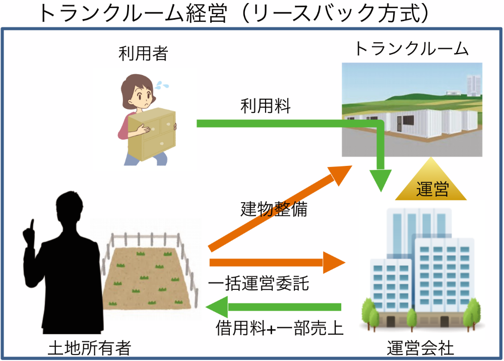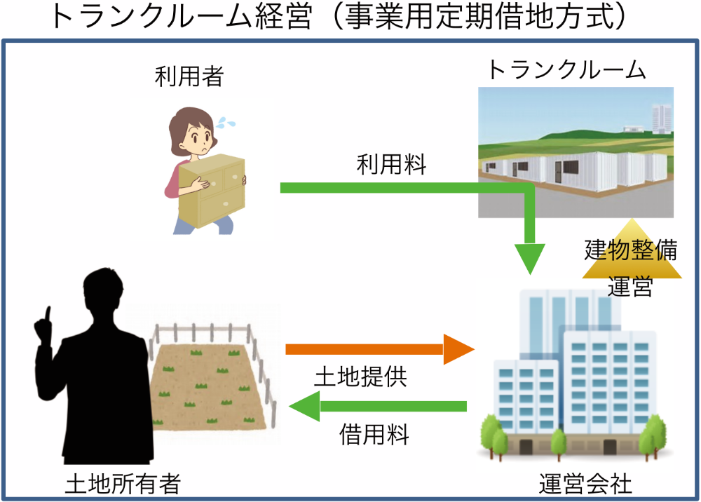土地所有者は業者に土地を定期借地するだけで、トランクルーム設備の整備及び運営を運営業者が全て負担する方式です。