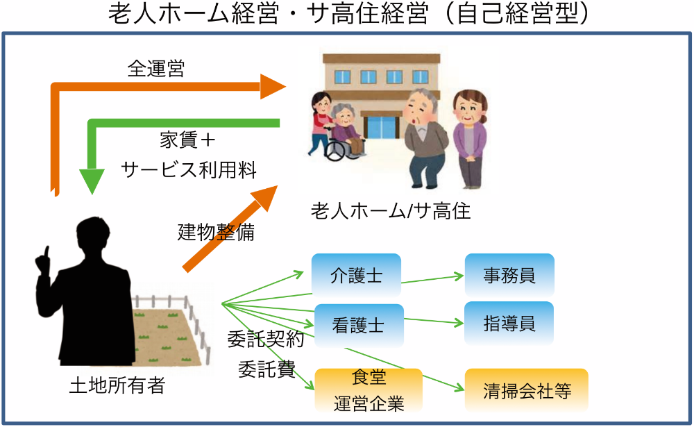 オーナーが自ら経営者となり運営する方式です。オーナー自ら法人登録し、登録した企業が介護サービスを提供する方法です。収益としては、オーナー及び設立した企業に全ての収入が得られますが、人材の雇用、入居者の募集や確保、維持管理などがオーナーの責任となります。また新たな事業化申請において、コンサル企業等の協力を仰ぐ必要があり手間がかかります。